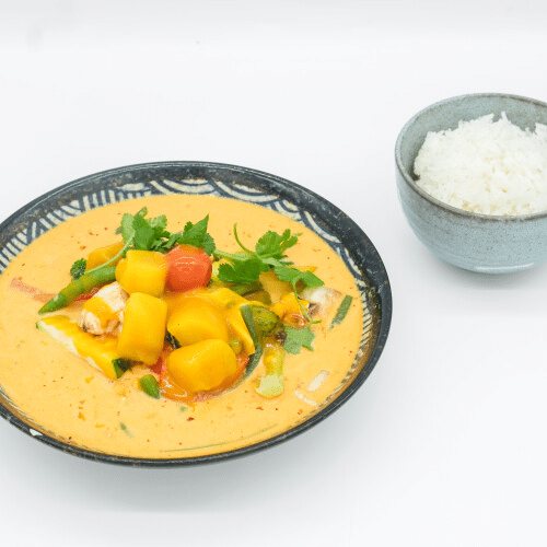 Hausgemachtes rotes Curry mit paniertem Hähnchenfilet und Süßkartoffeln, Brokkoli und Weißkohl, dazu servieren wir Duftreis.